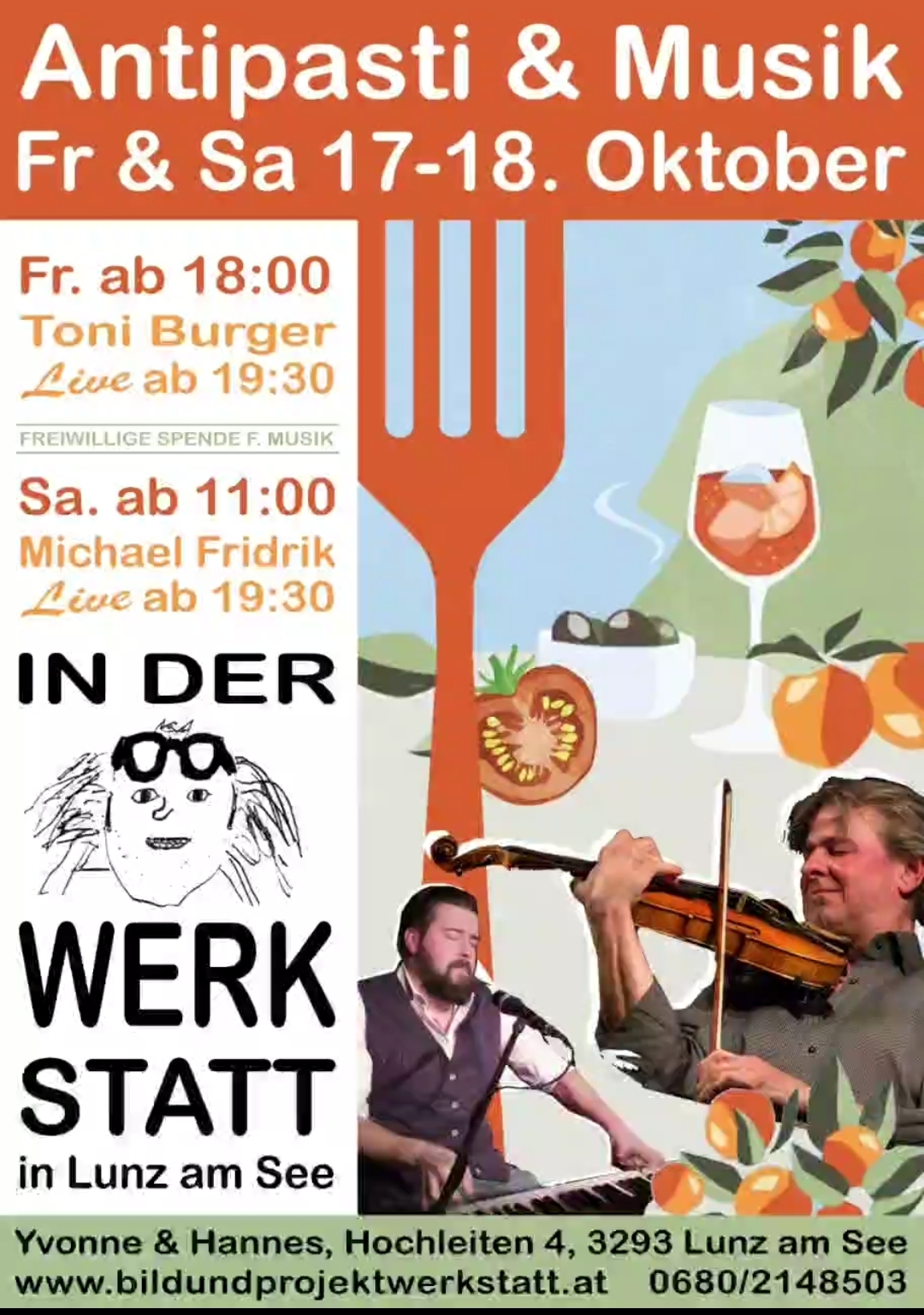 Antipasti & Musik IN DER WERKSTATT in Lunz am See Freitag ab 18:00 Uhr / Toni Burger LIVE ab 19:30 UhrSamstag ab 11:00 Uhr / Michael Fridrik LIVE ab 19:30Freiwillige Spende für Musik Teile den Artikel ⇐ zurück