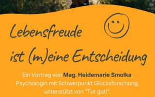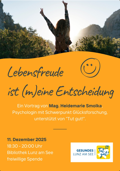 Lebensfreude ist (m)eine Entscheidung Ein Vortrag von Mag. Heidemarie Smolka, Psychologin mit Schwerpunkt Glücksforschung unterstützt von ''Tut gut!''. - 11. Dezember 2025 von 18:30 bis 20:00 Uhr- veranstaltet von der Gesunden Gemeinde Lunz am See- Bibliothek Lunz am See- freiwillige Spende Teile den Artikel ⇐ zurück